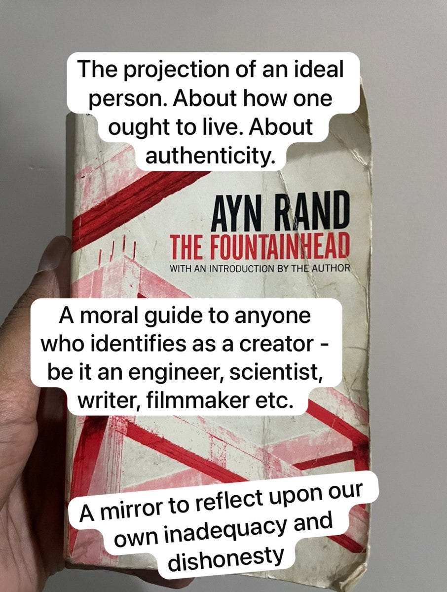 The Fountain Head. I bought this a decade ago but completed it now. I wish I had read it earlier. Ayn Rand did a wonder projecting an ideal man and his work ethic. The work ethic, which reminds one of Karma Yoga and Gita.